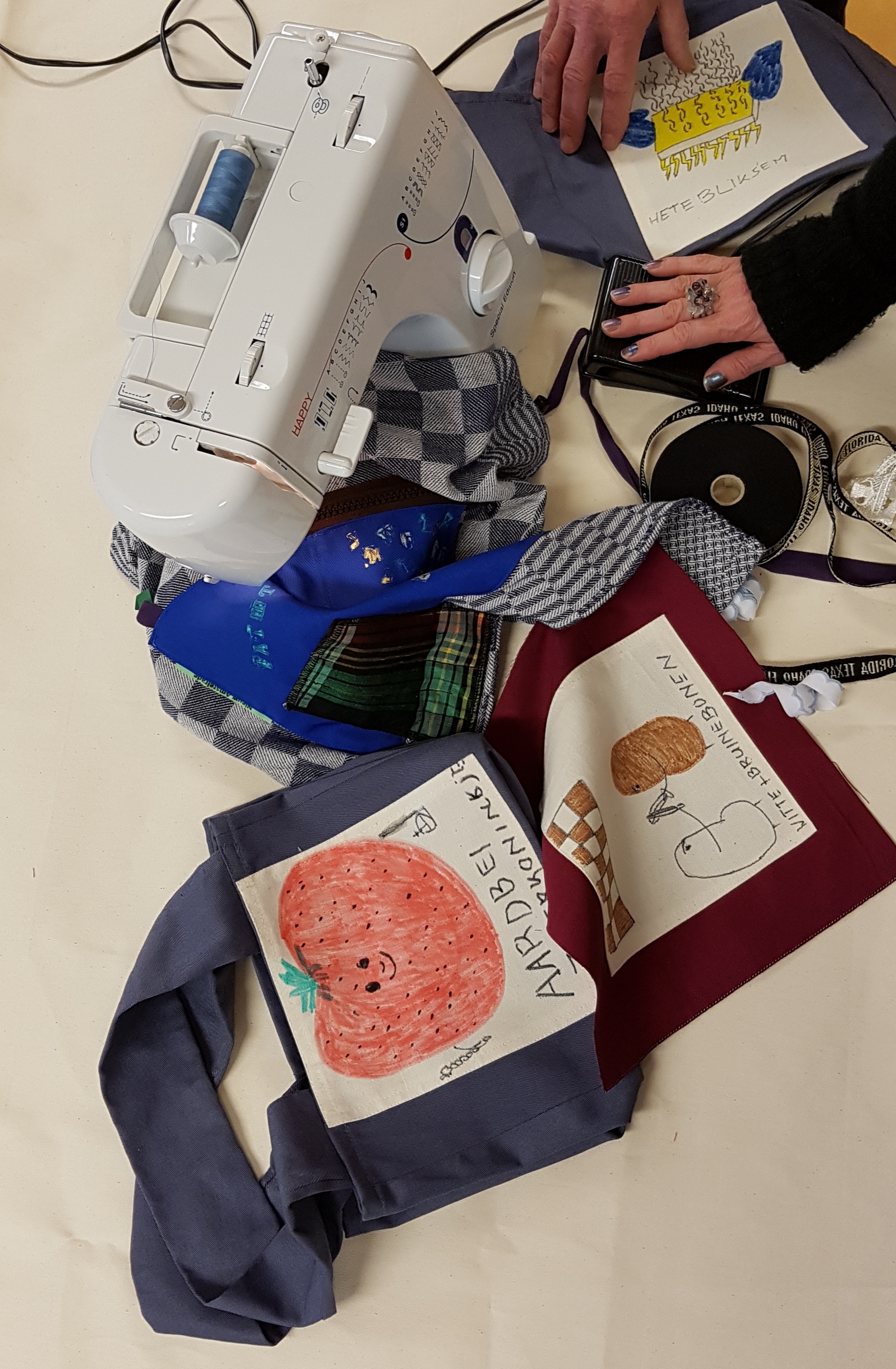 ![]() | Diverse deelnemers Soms werken meerdere mensen aan een product. Dit is het geval bij producten die wij doorlopend maken, zoals knnuffels, kussens en schorten. Het kan zijn dat bijvoorbeeld iemand de kleuren voor een schort of knuffel kiest, maar dat het product door iemand anders wordt gestikt. Het zijn prducten die doorlopend door alle deelnmers gezamelijk worden gemaakt.